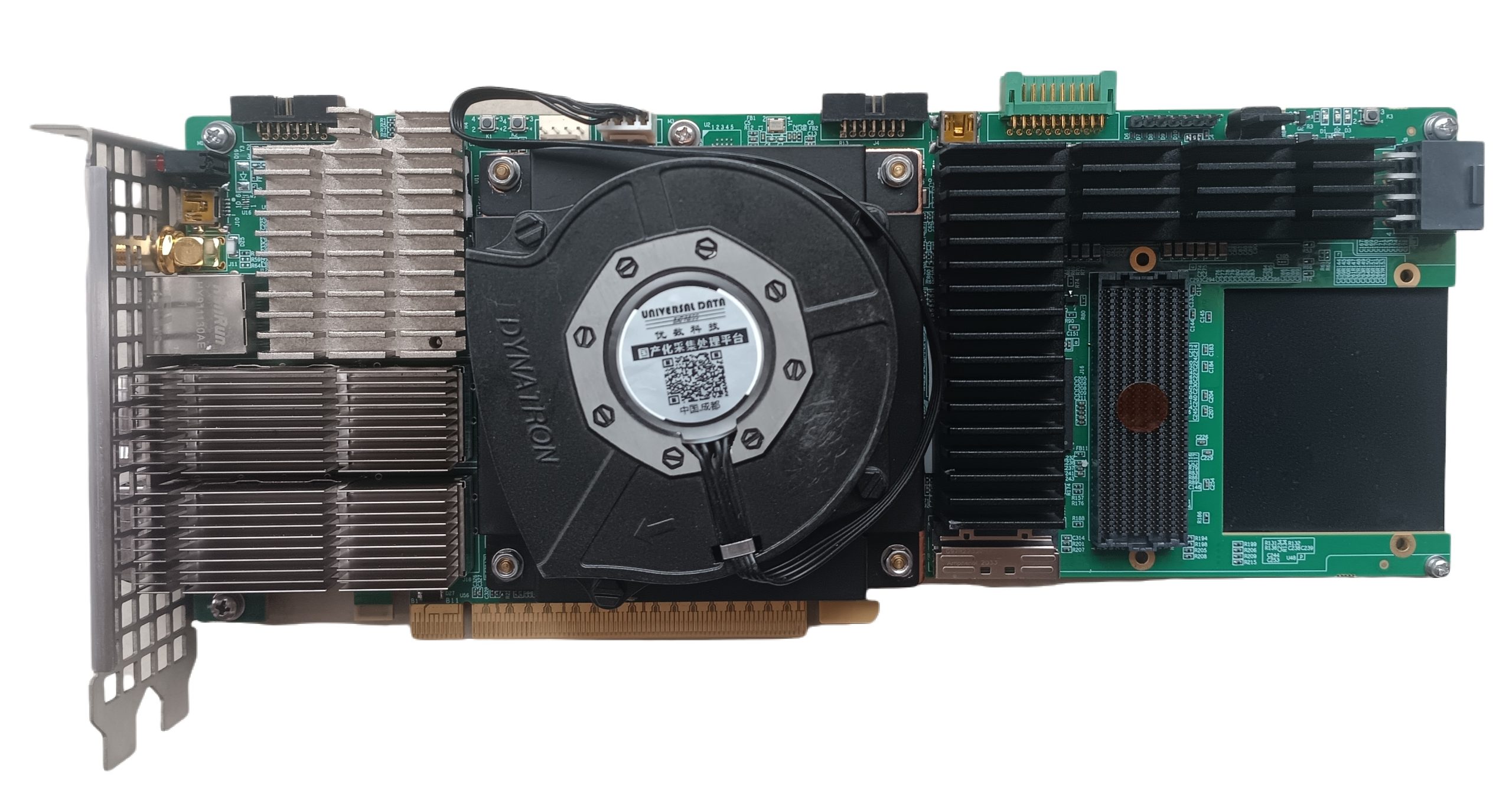 UD PCIe-403信号处理模块为标准PCIe全高全长双槽结构,基于VU13P+ZYNQ架构,对外有PCIe3.0×16、PCIe4.0×8(国产器件)、100G以太网、千兆以太网、GPIO和串口等,可以插入标准机箱使用,也可以单独+12V供电使用。模块采用全国产化设计,也可搭载进口芯片。FPGA搭载4组72bit位宽的DDR4存储器,非常适合于算法验证、硬件加速、高缓存吞吐率等场景应用。板载有1个FMC+(兼容FMC子板)接口,满足VITA57.1和VITA57.4规范(只全互联了LA[33:0]和GTY[23:0]),可以适配大多数ADC/DAC FMC或FMC+子卡。全部器件选择工业级和以上质量等级元器件。